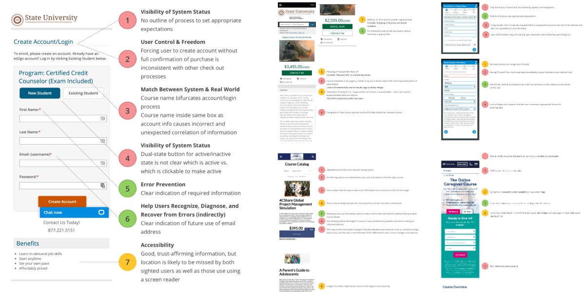 I used NNG's 10 Usability Heuristics to evaluate current Ed2Go site as well as its top competitors, which surfaced the checkout flow and course pages as critical redesign priorities.